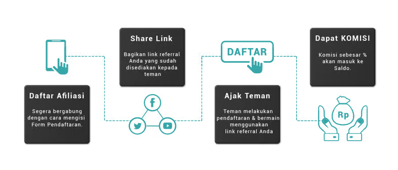 Dengan semakin banyaknya orang yang menggunakan kode referral Anda untuk registrasi dan bermain disitus kami, semakin menguntungkan untuk Anda dan semua orang! Semua teman Anda yang turut melakukan registrasi dan bermain di kami akan mendapatkan kesempatan untung memenangkan jackpot dari kami. Kami juga akan memberi Anda komisi karena berhasil mengajak teman-teman Anda untuk bermain di kami. Dengan ikut serta dalam Program Referral kami, Anda akan mendapatkan komisi untuk setiap teman yang bermain di kami sesuai dengan syarat dan ketentuan yang berlaku.